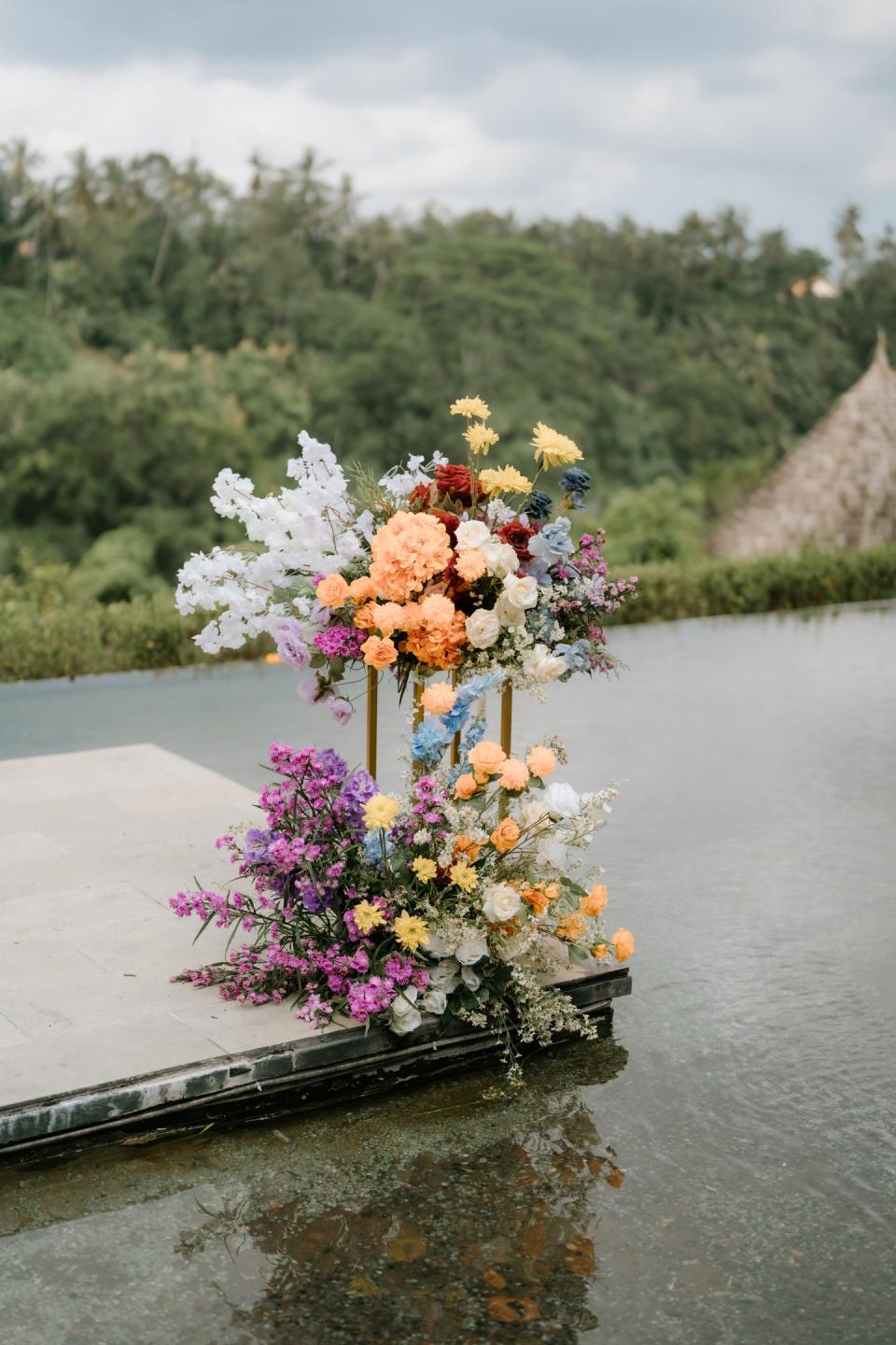 Embrace a natural or bohemian style with free-form, curvy arrangements; hanging bouquets; or tall floral installations on the altar. These colours work particularly well with outdoor, rustic or tropical altars.