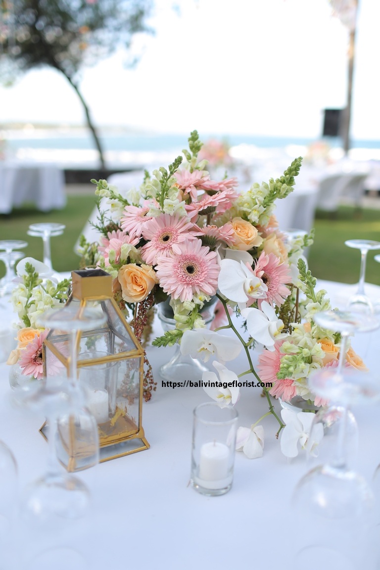 We can also created centerpiece for any thematic style to meet with your traditional custom such as Chinese theme color, Indian color or centerpiece for Indian wedding dinner. We use anykind of vases to compose the centerpiece like glass vase, mirror base, chandelier, tea light candle, rustic wood, wooden base, and many other material. It is again depend on the theme of your party.