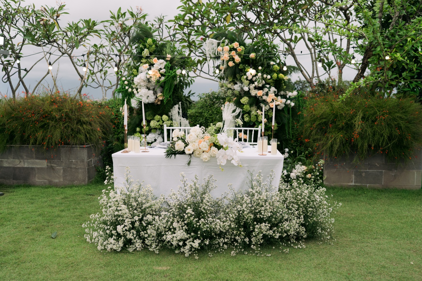 The sweetheart table, positioned on the lush lawn, was an architectural masterpiece of florals. Bali Vintage Florist transformed the space with a generous use of baby’s breath (gypsophila), creating a cascade of delicate white clouds that appeared to spill onto the grass. The table itself was a vision of purity, adorned with a luxurious, cascading centrepiece of white and peach roses, delicate tulips, and fresh green hydrangea, all balanced by white Tiffany chairs and a delicate golden candle centrepiece. The overall feel was light, airy, and undeniably romantic.
