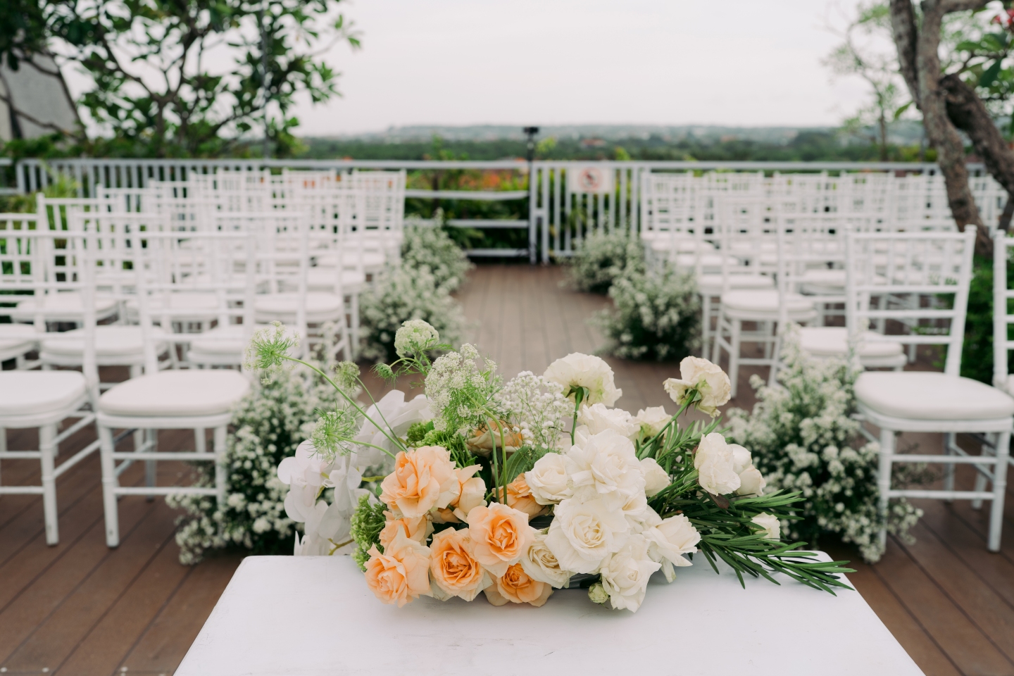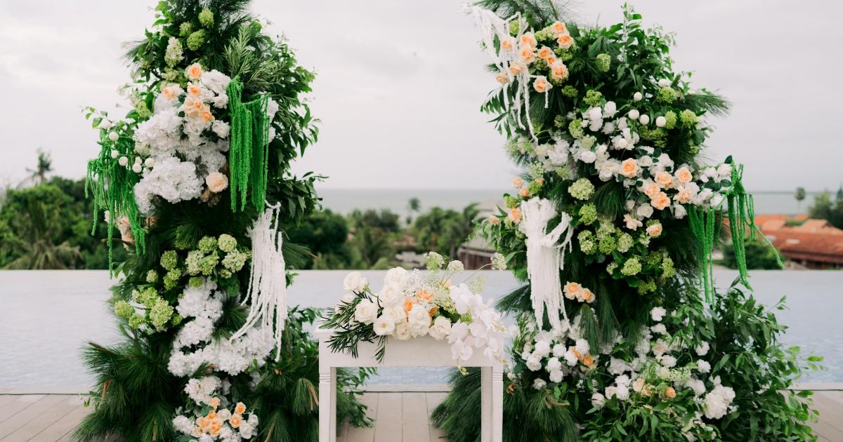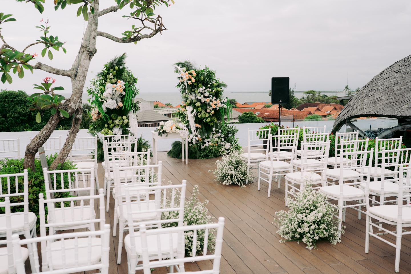 The ceremony space on the rooftop deck was equally curated. Simple white Tiffany chairs lined a wooden pathway, with clusters of baby’s breath in the aisles. The welcome area featured a minimalist gold-framed welcome sign with elegant typography that perfectly balanced the chic, modern Balinese aesthetic. From the unique floral arches that combined roses, tulips, hydrangeas, cotton bolls, and cascading white tassels to the detailed table settings with soft grey napkins and elegant silverware, every element was considered.