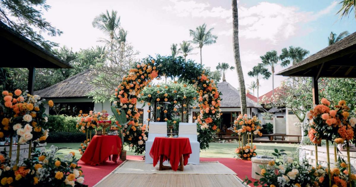 A stunning Indian wedding decor at the Holiday Inn Baruna, Bali, perfectly capturing the essence of a traditional celebration. An elegant Mandap decor, with vibrant red and gold drapery, floral arrangements, and a beautifully adorned aisle. This setup provides a regal and festive atmosphere, ideal for Indian wedding. The Haldi ceremony decor, where lush orange and yellow marigold flowers create a radiant backdrop, emphasizing the joyful and auspicious nature of the event. These arrangements by Bali Vintage Florist combine traditional Indian elements with the scenic beauty of Bali, making them perfect for couples seeking authentic Indian wedding decor in Bali.