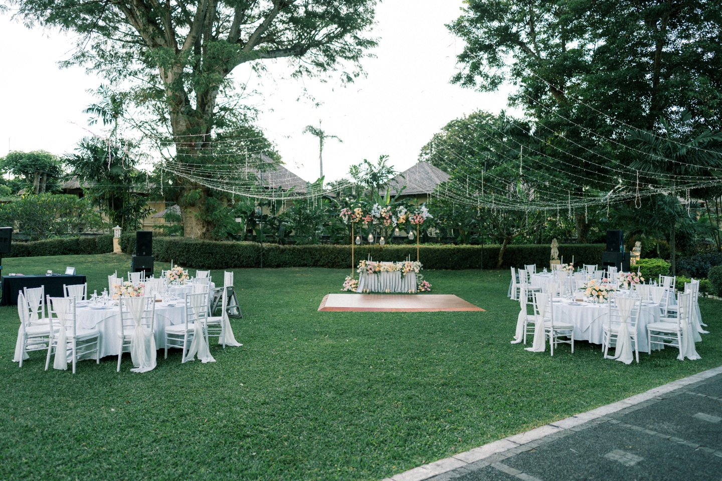 Floral decorations breathe aesthetic life into a wedding in Prama Sanur. White, pink, and natural greenery form a timeless trio, representing elegance, tenderness, and naturalness in visual harmony.