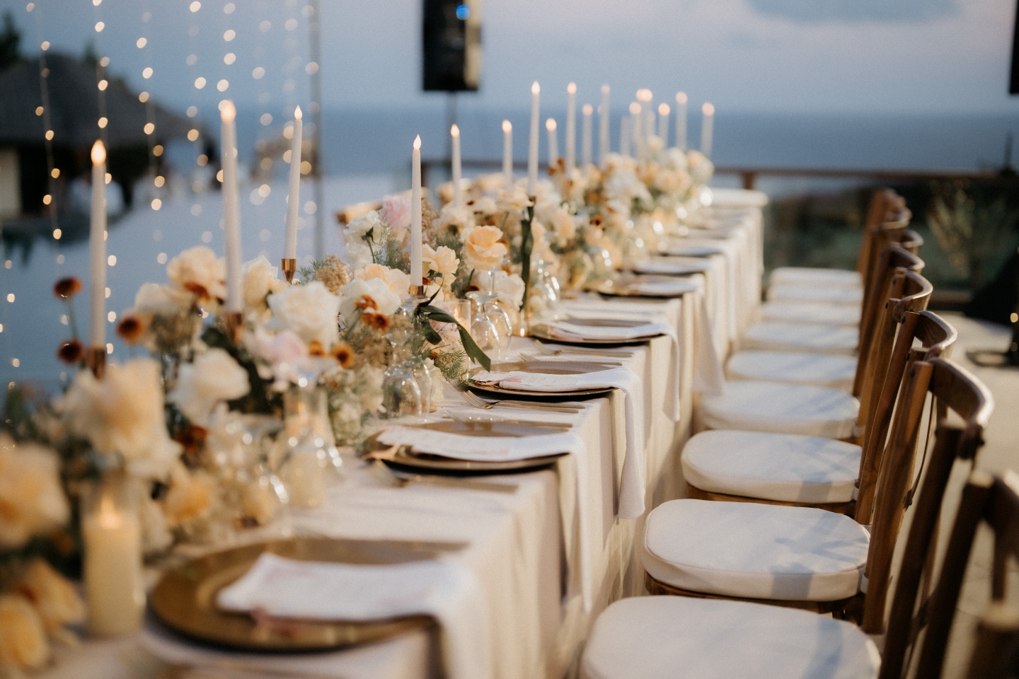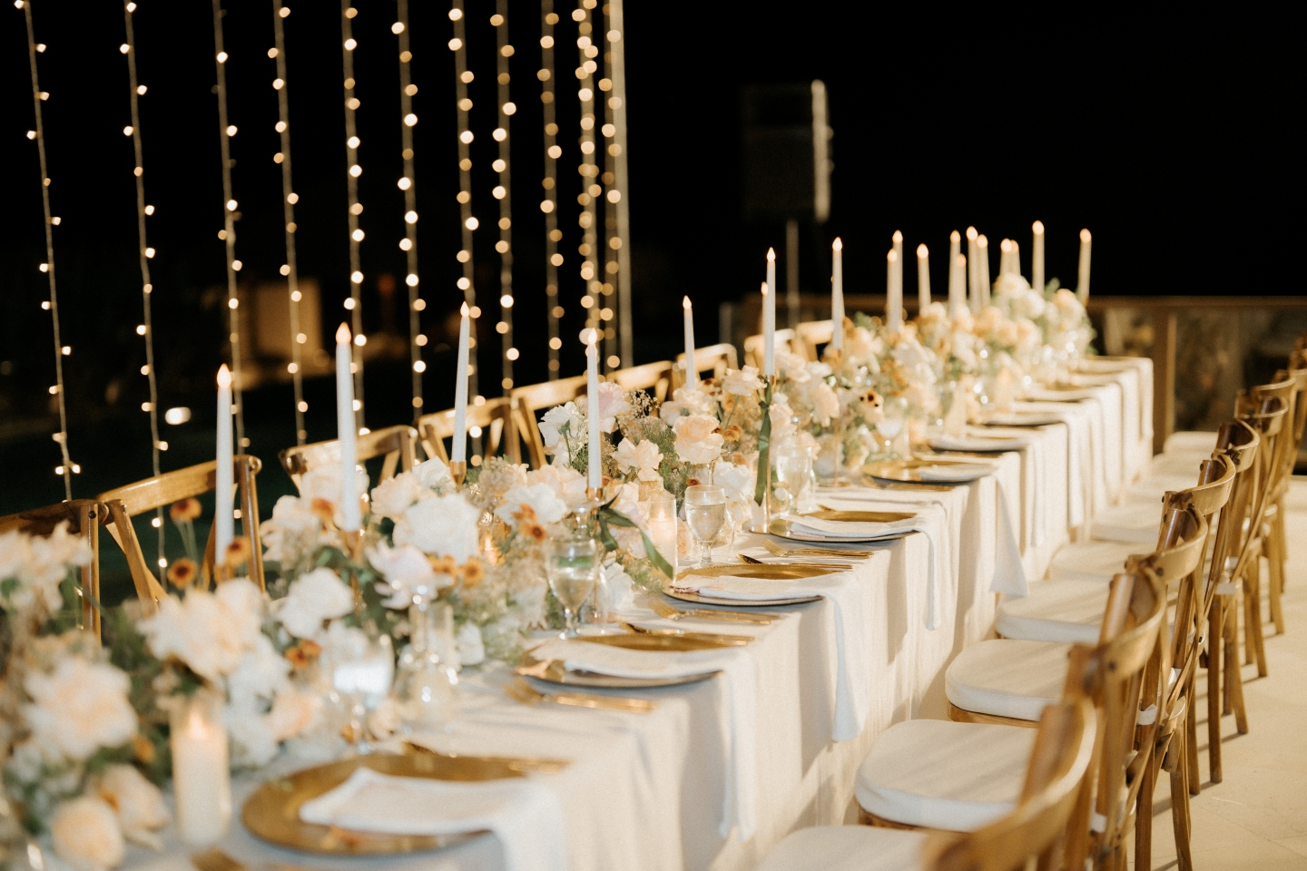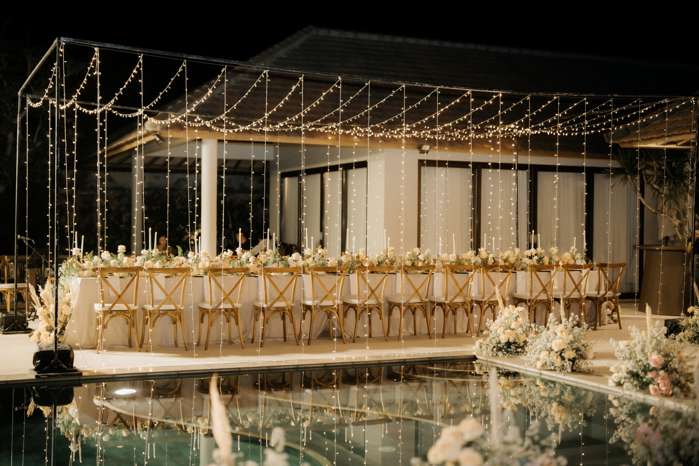• Ambience: The warm string lights created a "tent" effect without blocking the open night sky, reflecting beautifully off the estate's infinity pool.