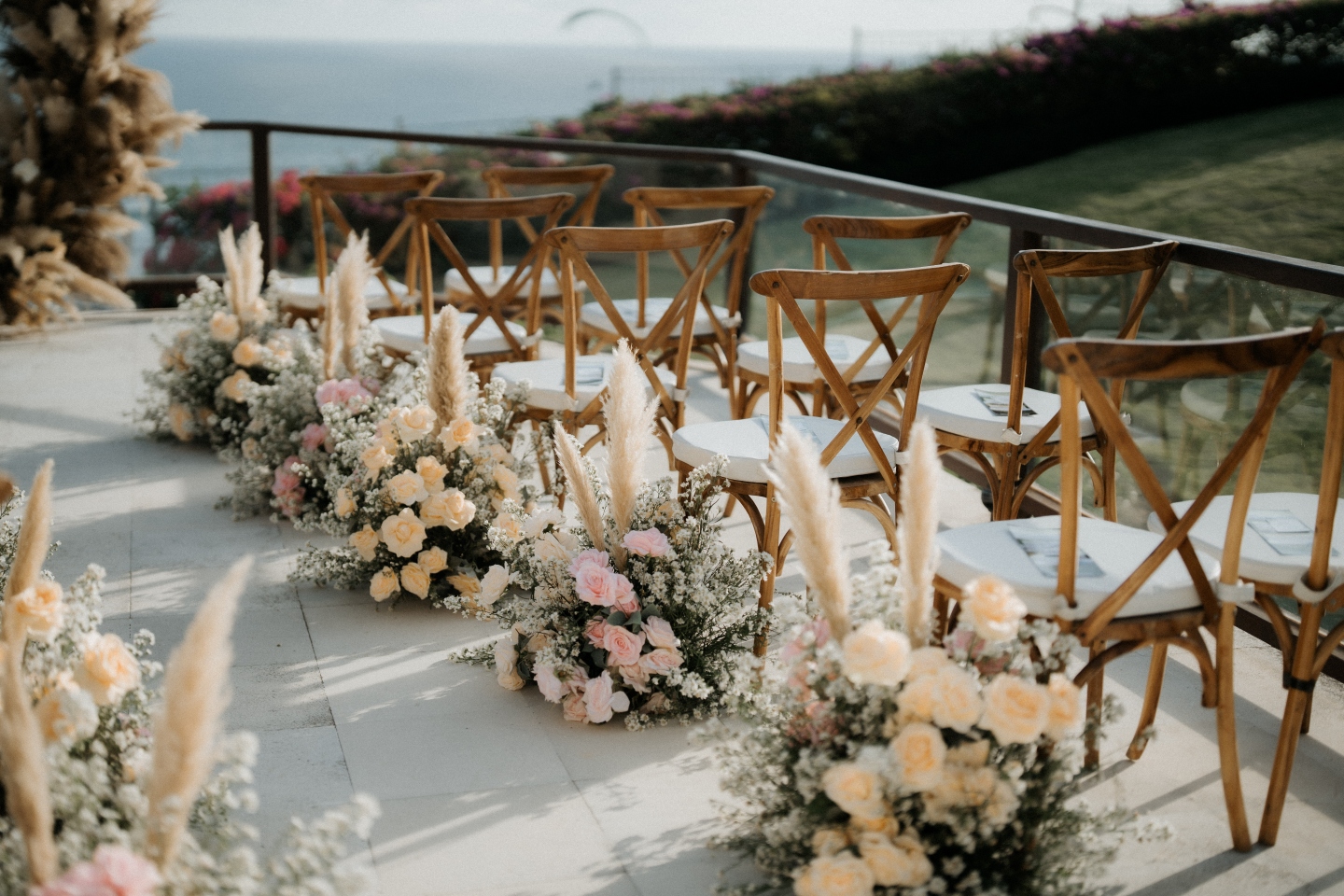 • The Aisle: Keeping the focus on the view, the aisle featured low-lying arrangements of baby’s breath and pampas, leading to wooden cross-back chairs that enhanced the rustic-organic vibe.