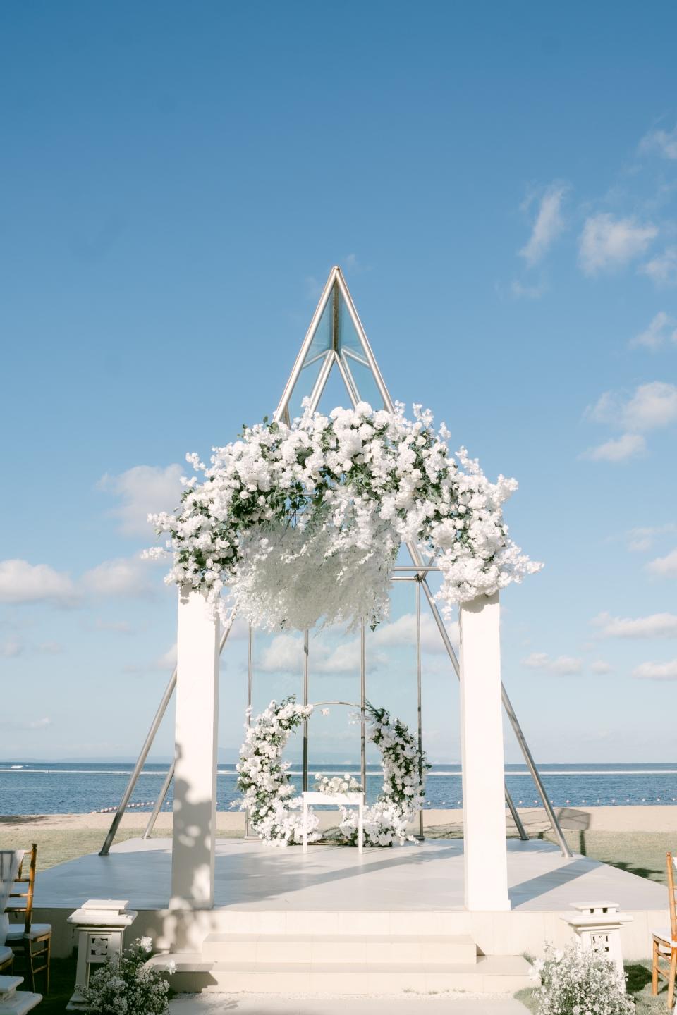 Arch atau pelaminan dengan bunga putih seperti mawar, lily, atau hydrangea yang dipadukan daun hijau tropis seperti monstera atau eucalyptus menciptakan focal point yang menawan. Arch ini cocok untuk foto pre-wedding maupun saat akad nikah.