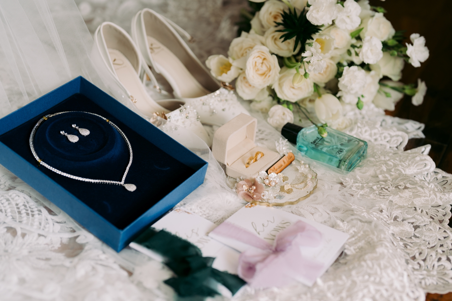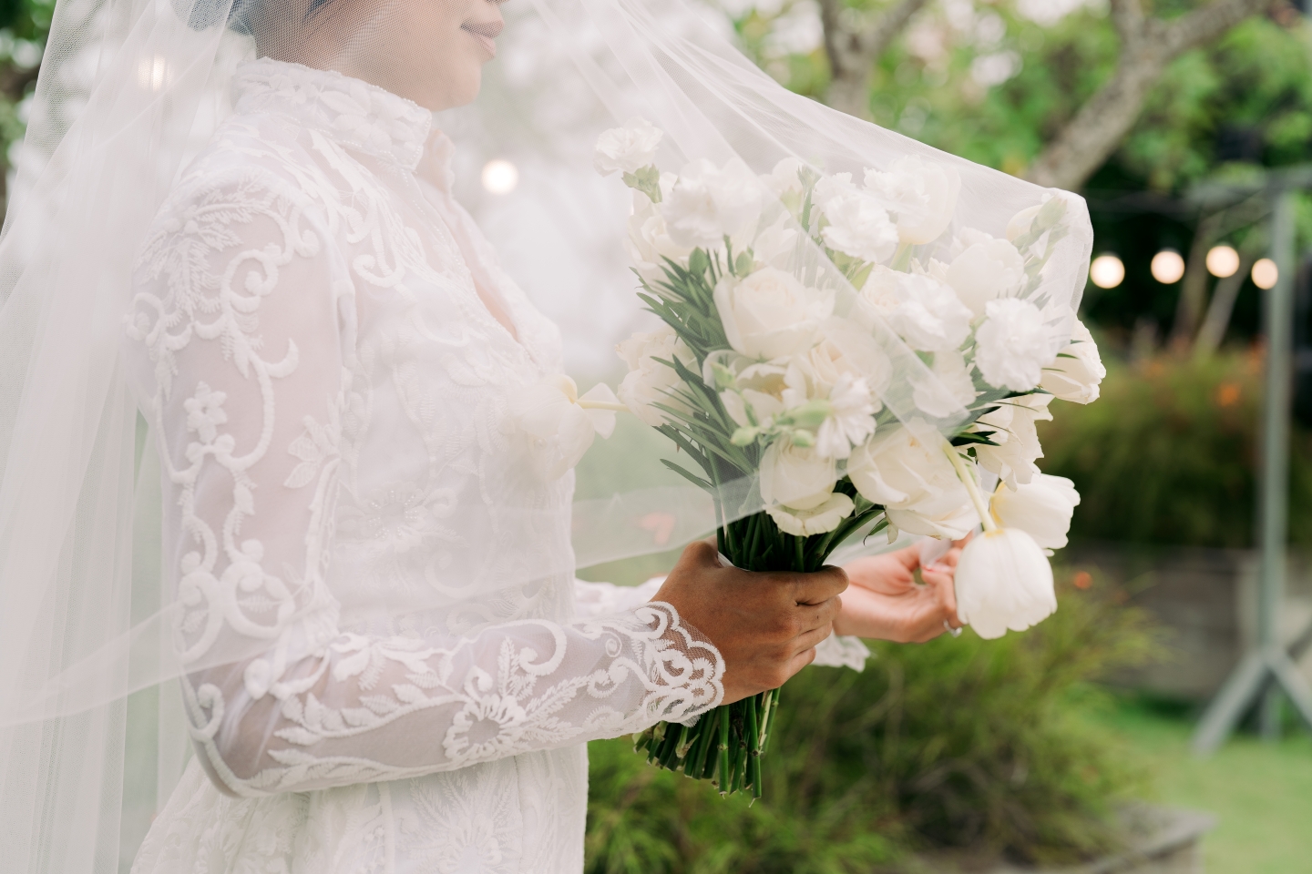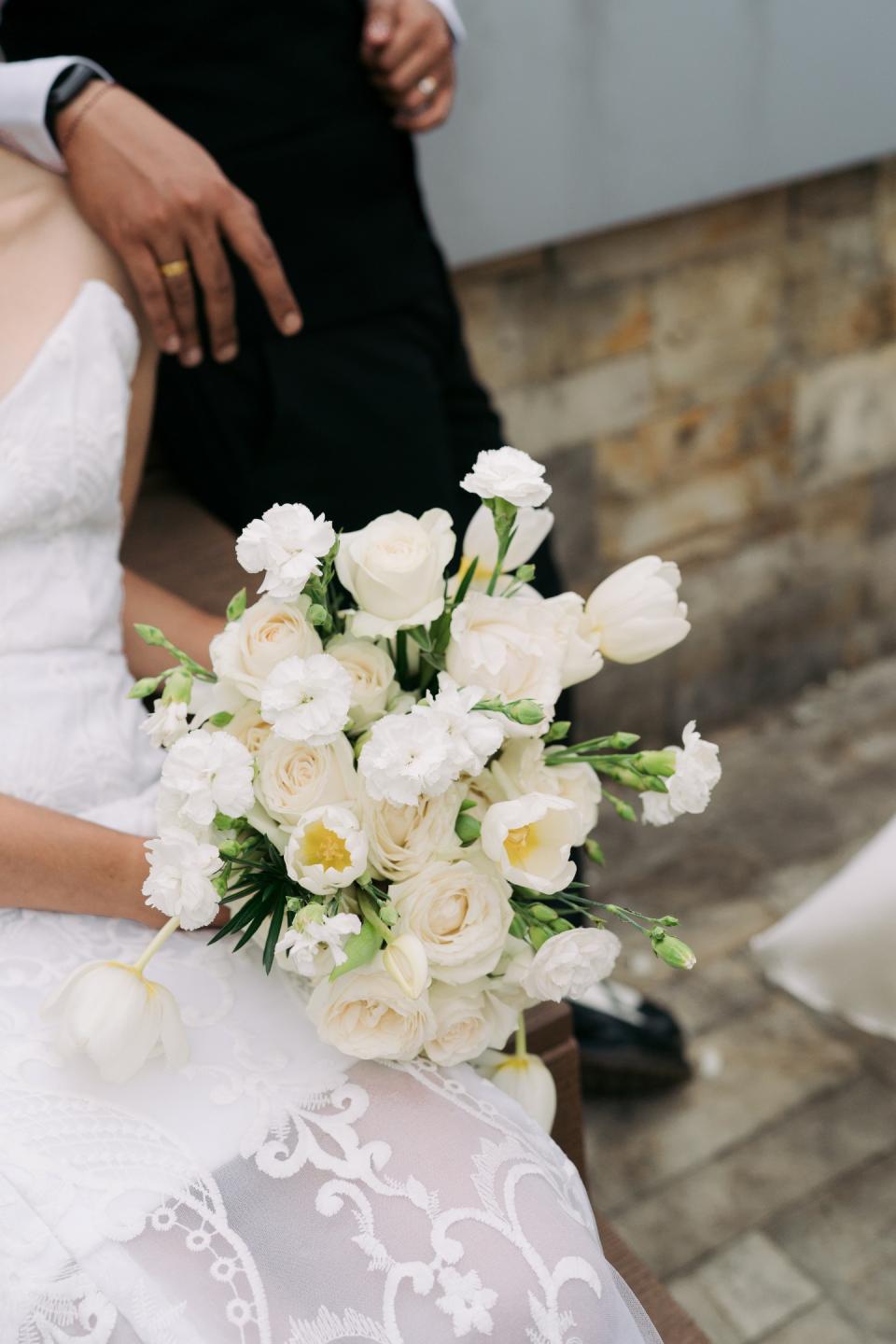 The bride’s bouquet was a perfect example of a modern composition. A non-traditional blend of classic white roses, soft spray carnations, and—the star of the show—delicate open white tulips with yellow centres, it was an effortless, non-linear masterpiece. Digitally held by the bride in her intricately patterned lace dress, it mirrored the sophistication of the couple’s walk through the lush gardens.