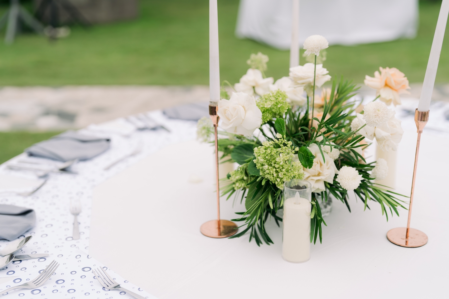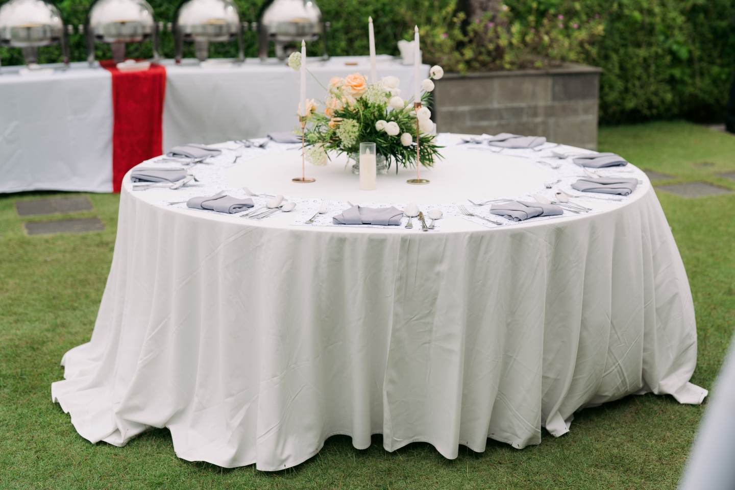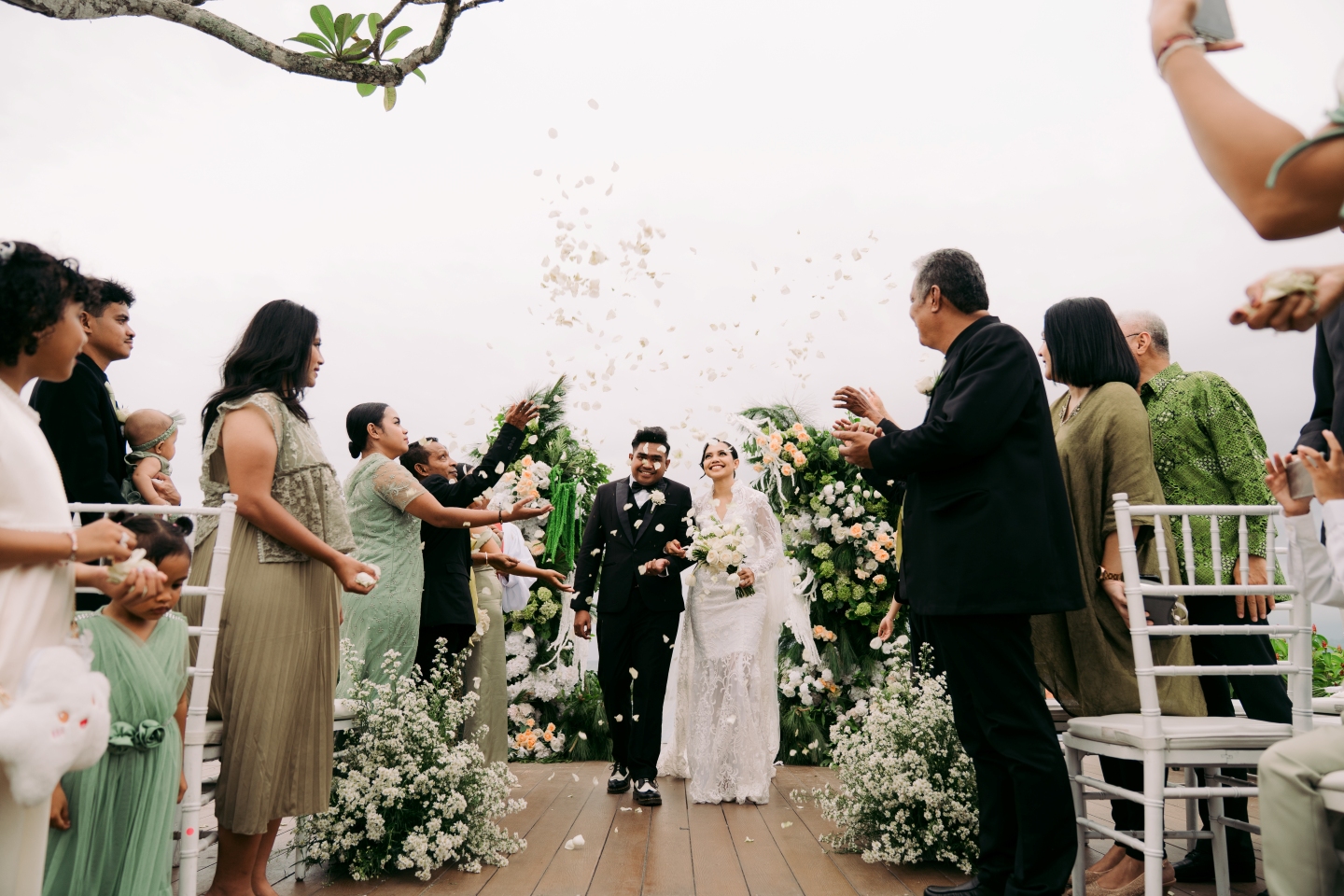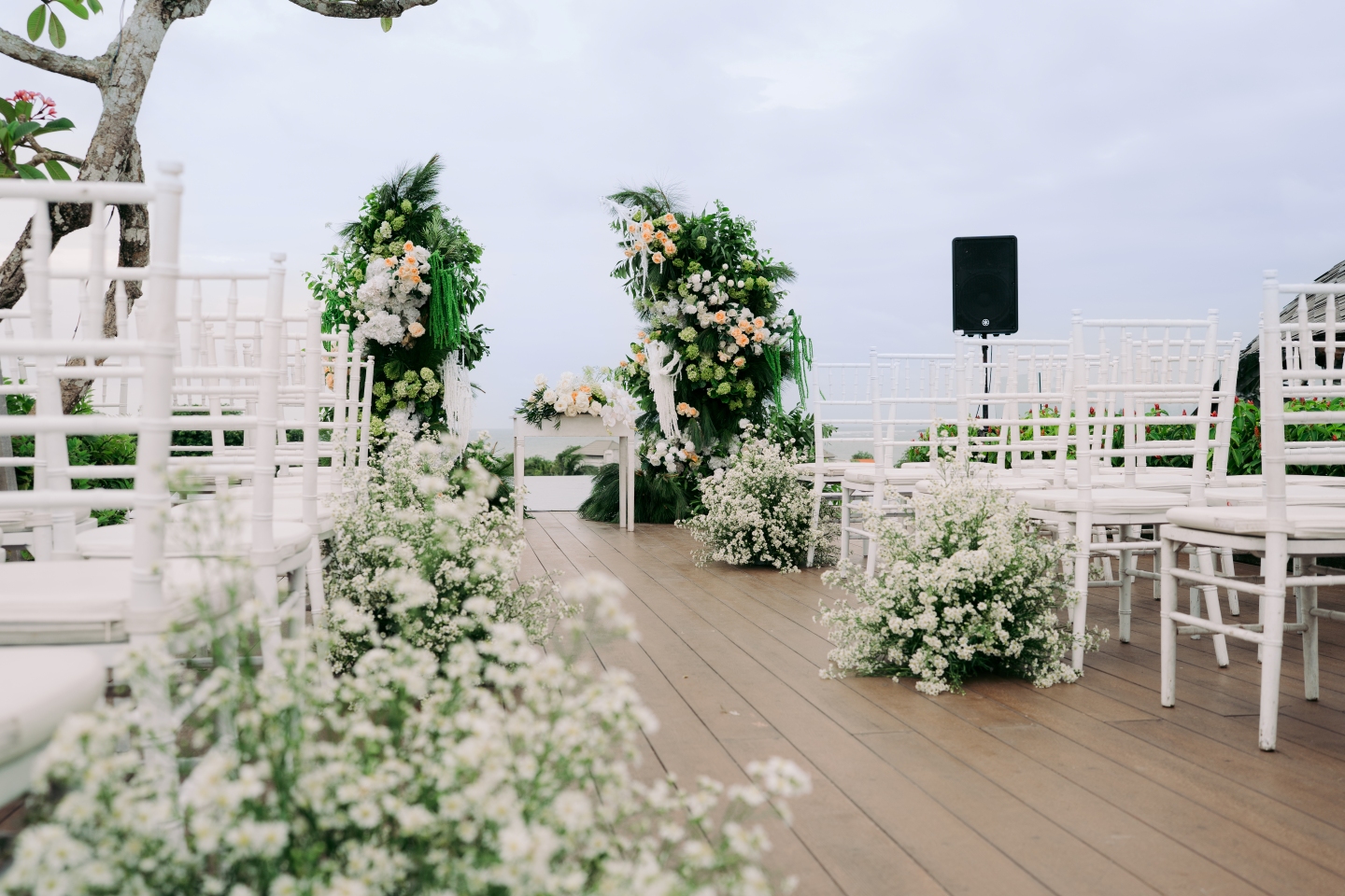 The sweetheart table, positioned on the lush lawn, was an architectural masterpiece of florals. Bali Vintage Florist transformed the space with a generous use of baby’s breath (gypsophila), creating a cascade of delicate white clouds that appeared to spill onto the grass. The table itself was a vision of purity, adorned with a luxurious, cascading centrepiece of white and peach roses, delicate tulips, and fresh green hydrangea, all balanced by white Tiffany chairs and a delicate golden candle centrepiece. The overall feel was light, airy, and undeniably romantic.