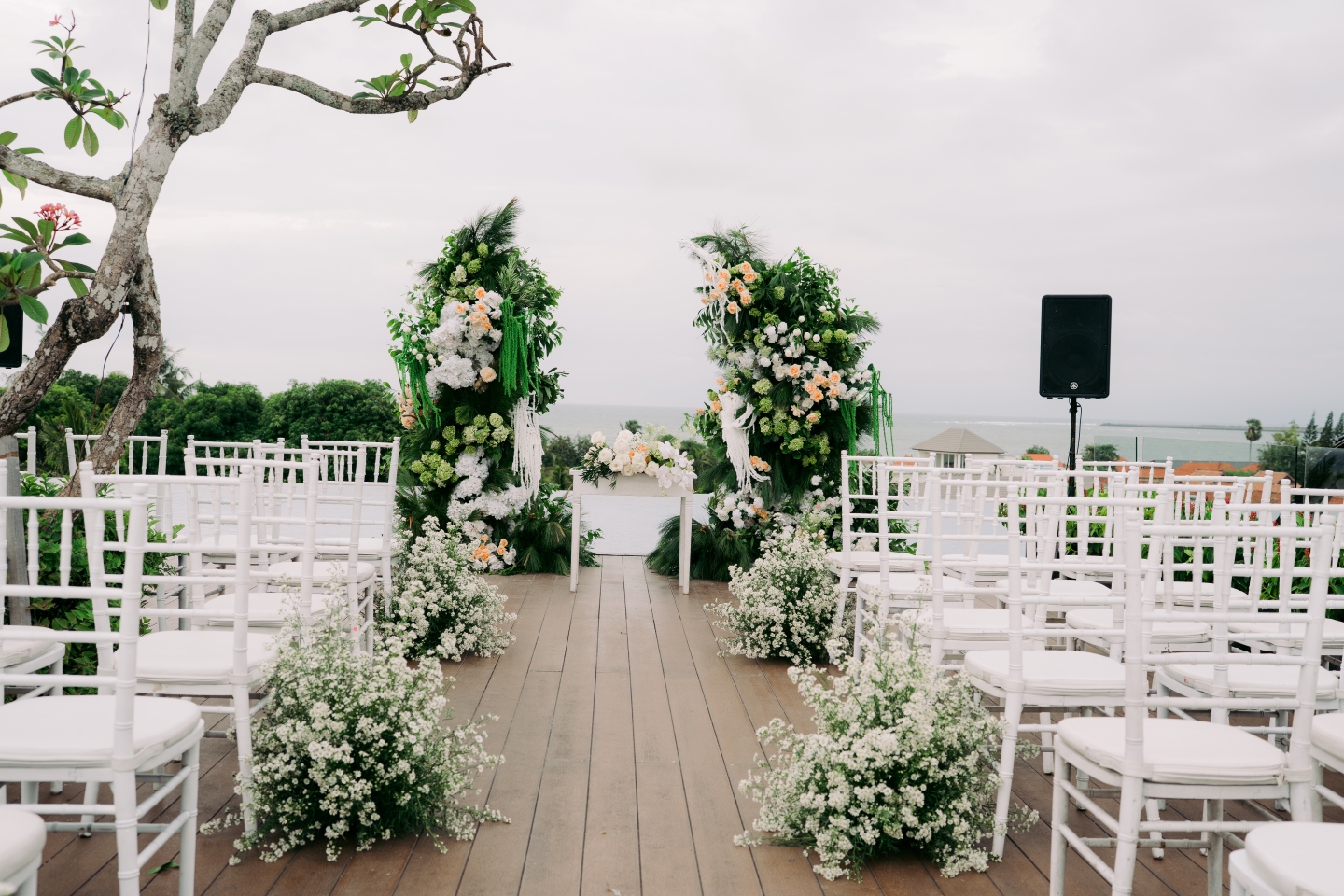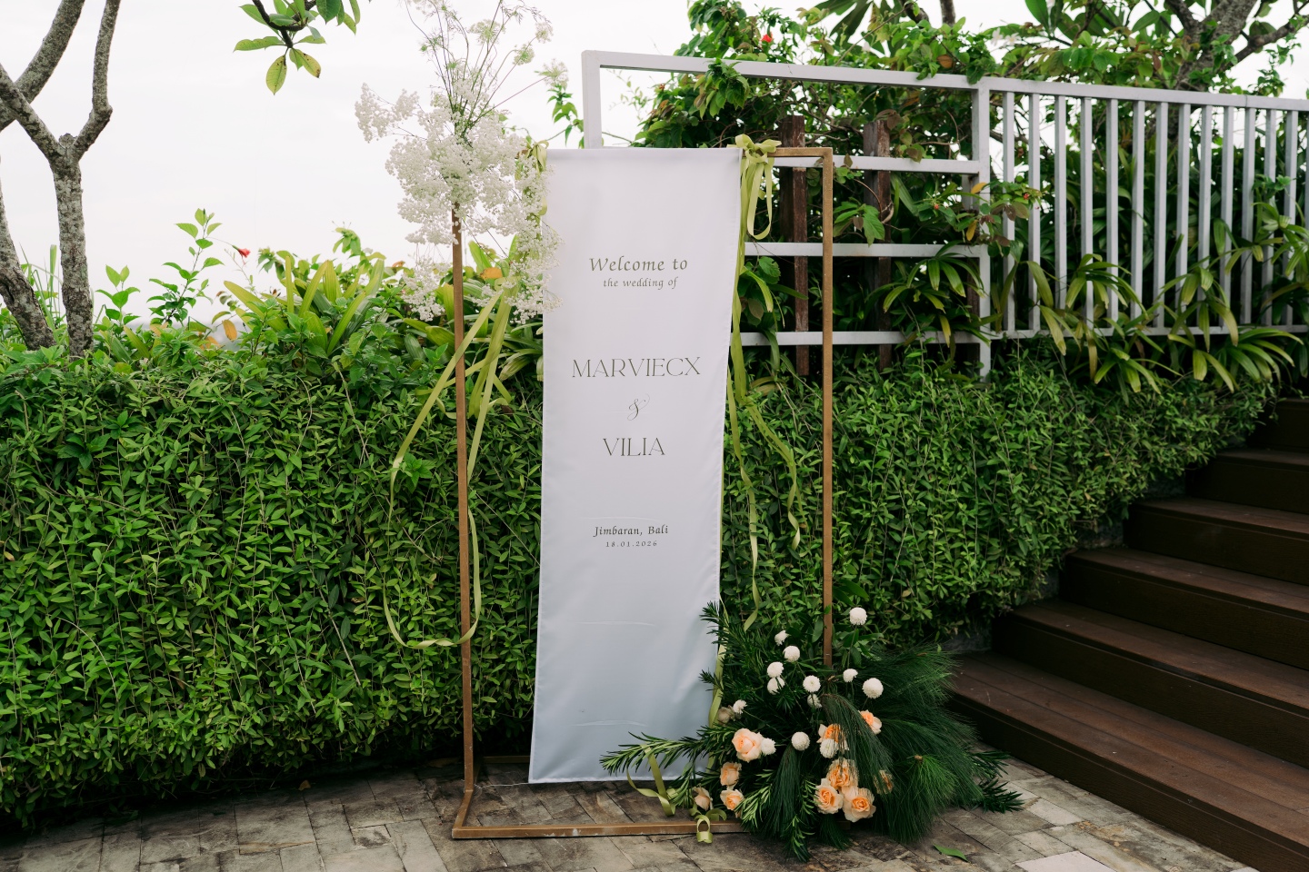 The ceremony space on the rooftop deck was equally curated. Simple white Tiffany chairs lined a wooden pathway, with clusters of baby’s breath in the aisles. The welcome area featured a minimalist gold-framed welcome sign with elegant typography that perfectly balanced the chic, modern Balinese aesthetic. From the unique floral arches that combined roses, tulips, hydrangeas, cotton bolls, and cascading white tassels to the detailed table settings with soft grey napkins and elegant silverware, every element was considered.