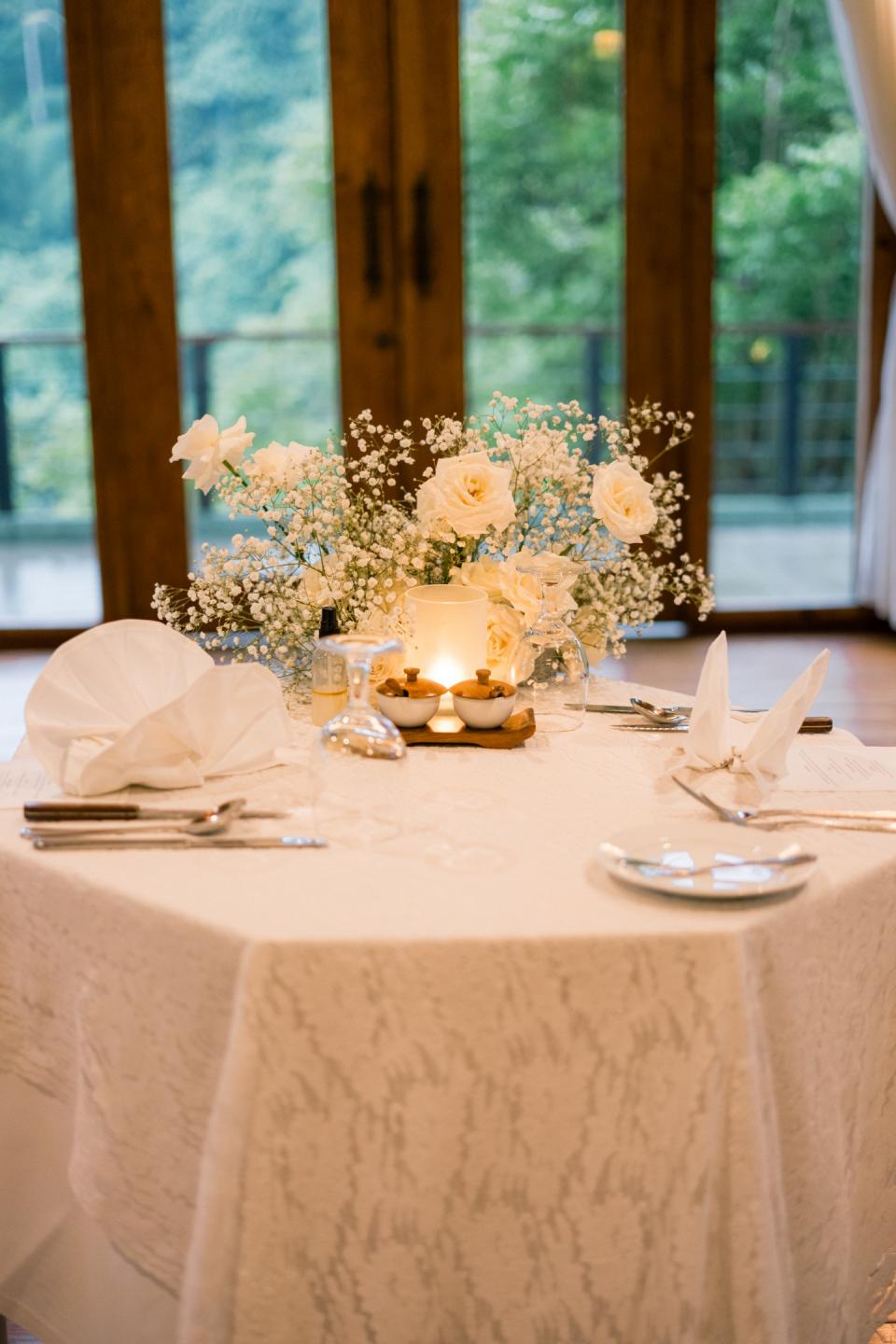 Place a few white rose stems in clear vases or floating in water for minimalist, elegant tablescapes your guests will adore.